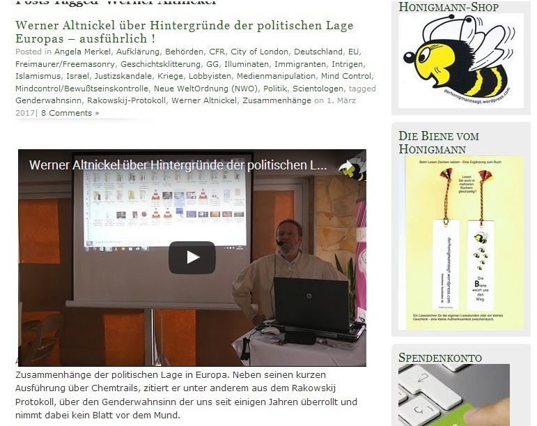 Auch bei dem sogenannten „Honigmann-Treffen“ im Februar 2017 trat Werner Altnickel schon als Redner auf. Der „Honigmann“, mit bürgerlichen Namen Ernst Köwing, wohnt im friesischen Varel und geriet zuletzt in die Schlagzeilen, als er wegen der Leugnung des Holocaust zu einer 6-monatigen Haftstrafe verurteilt wurde . Köwing ist der Betreiber des verschwörungsideologischen Blogs „der Honigmann sagt“.
