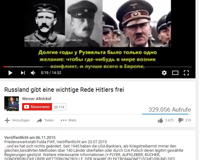 „Er warnt auch vor Masseneinwanderung und der „Vernichtung der weißen Rasse“, neuerdings ebenso vor „36 ultrageheimen Höchstgrad-Logen“, die angeblich die Welt regieren. Zu ihren Mitgliedern gehörten IS-Führer Abu Bakr al Bagdadi und Gerhard Schröder. Ebenfalls bei Youtube verbreitet Werner Altnickel die Theorie, Jüdinnen und Juden hätten nach dem Zweiten Weltkrieg eigene Konzentrationslager errichtet und dort 100 000 Kinder ermordet.“