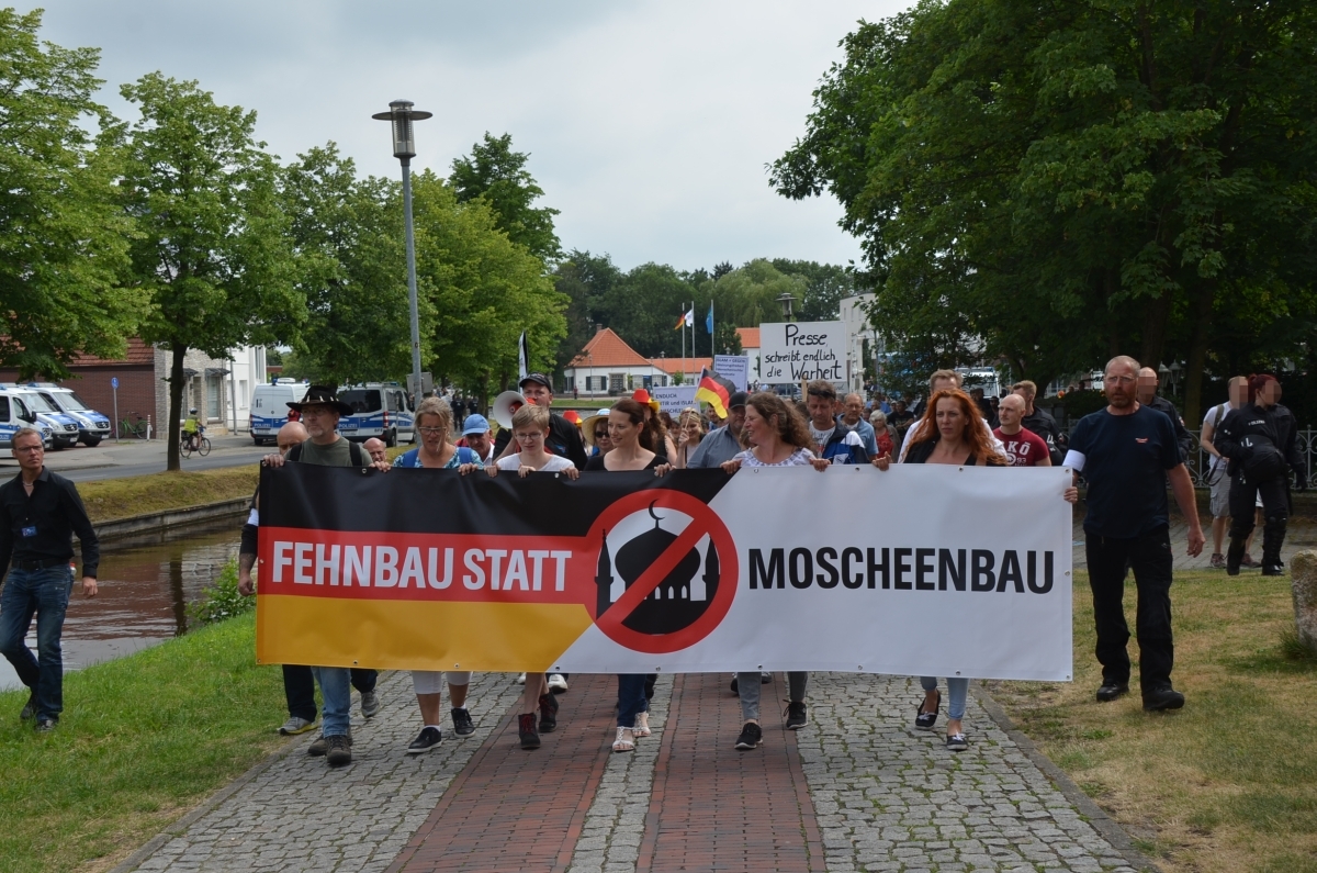 Und auch thematisch wurden nicht mehr vorrangig vermeintliche Frauen*rechte gegen Geflüchtete in Stellung gebracht. Man demonstrierte gegen einen geplanten Moscheebau in der emsländischen Kleinstadt. Und aller auch in unseren Augen berechtigter Kritik an DITIB, dem Trägerverband der geplanten Moschee, der eng mit dem türkischen Erdogan-Regime verbunden ist, zum Trotz, zeigte sich sehr schnell, worum es den Versammlungsteilnehmer*innen eigentlich geht. Auf dem Transparent der Demonstration war kein durchgestrichenes DITIB-Logo, sondern eine durchgestrichene Moschee zu sehen. In mehreren Redebeiträgen ging es nicht um Strukturen des türkischen Staats, sondern um eine vermeintliche „deutsche Kultur“, die sich durch „den Islam“ bedroht sehe.
