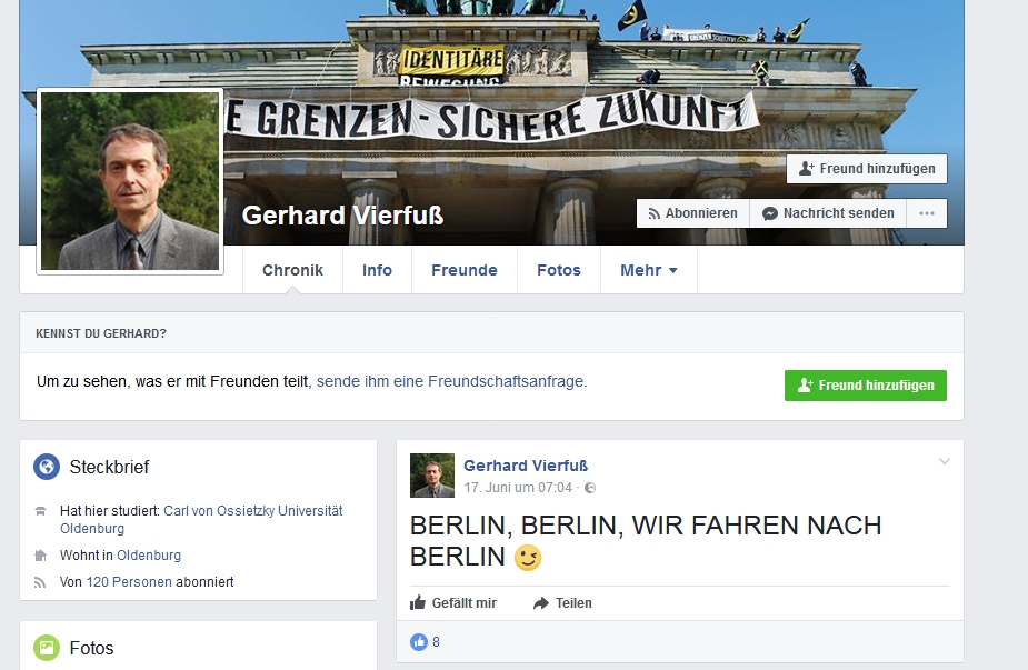 Doch Vierfuß‘ Engagement für den völkisch-nationalistischen Scheinriesen ist nicht nur beruflicher Natur. So besuchte Vierfuß als Privatperson eine Demonstration der „IB“ in Berlin und macht auch in sozialen Netzwerken keinen Hehl aus seiner Sympathie für die „Identitären“.