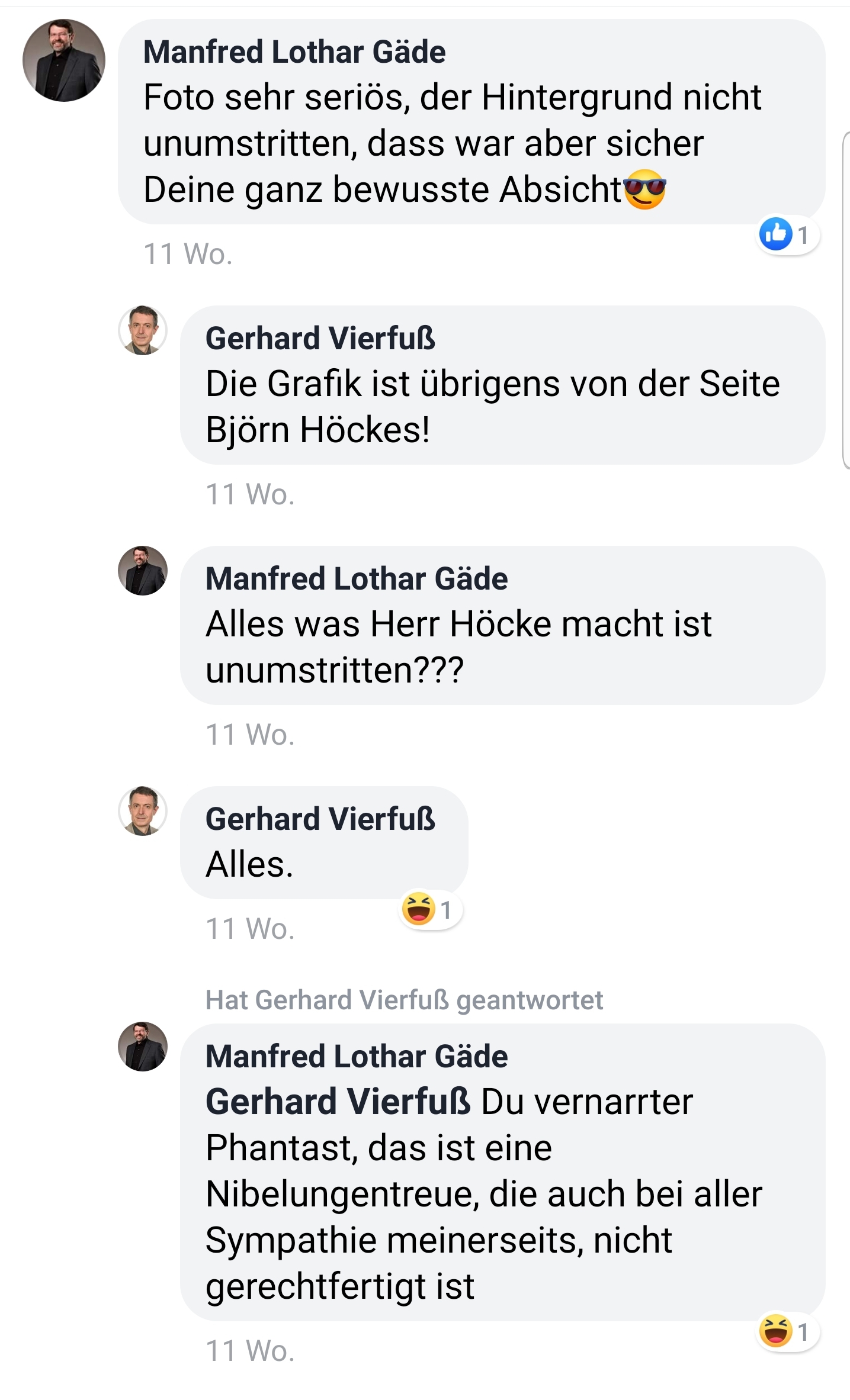 Es wird also deutlich, dass Gerhard Vierfuß sich klar zum radikalen völkischen „Flügel“ der AfD um Andreas Kalbitz und Björn Höcke zählt. In den sozialen Medien macht er hieraus auch keinen Hehl. Im Gegenteil: Vierfuß erklärt auf seiner Facebookseite, dass alles, was Herr Höcke mache, grundsätzlich unumstritten sei.