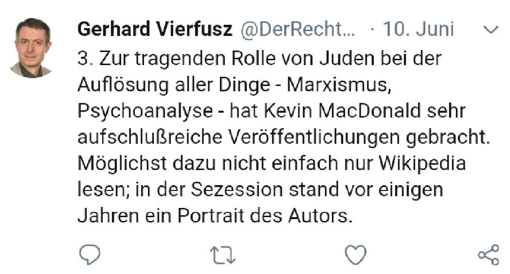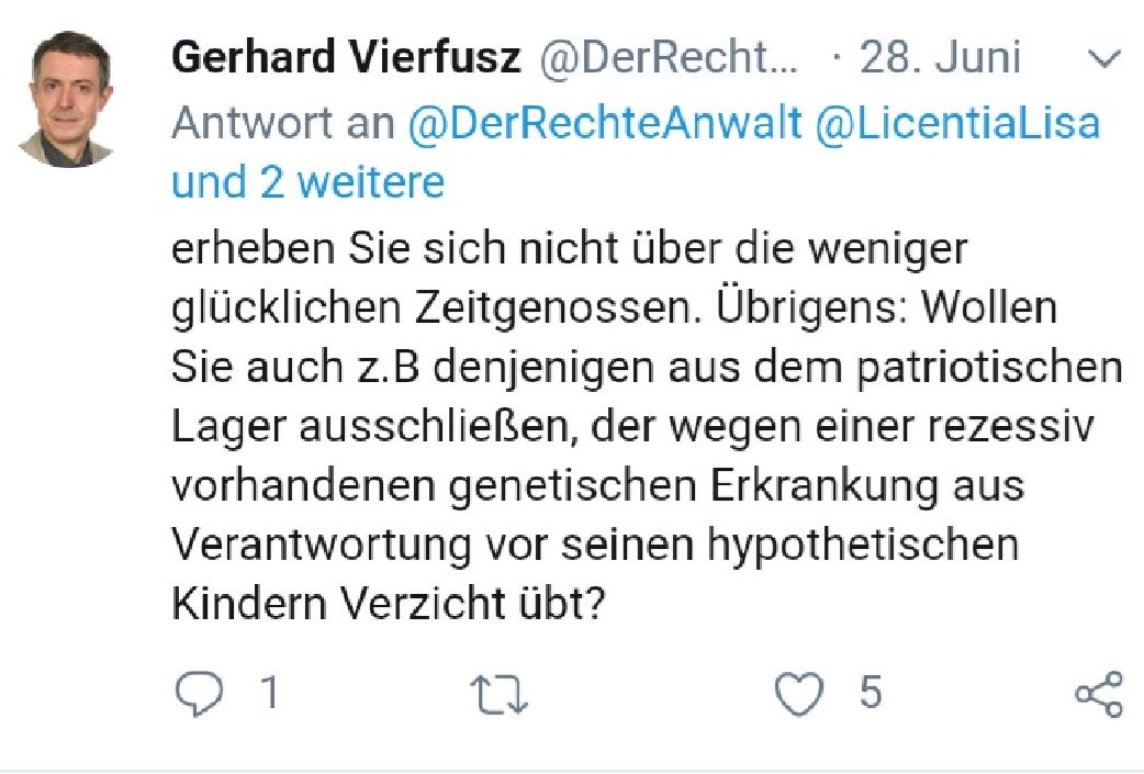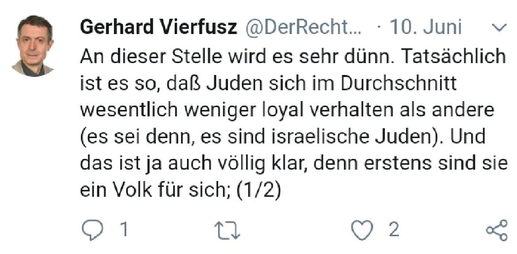 Im Übrigen äußert sich auch Vierfuß‘ Mitstreiter Andreas Vonderach unverblümt antisemitisch, etwa wenn er jüdische Menschen als „ökonomische und intellektuelle Elite“ beschreibt. „Die Ostjuden“ hätten „ihre einseitige Züchtung auf Intelligenz mit besonders vielen Erbkrankheiten erkauft“.