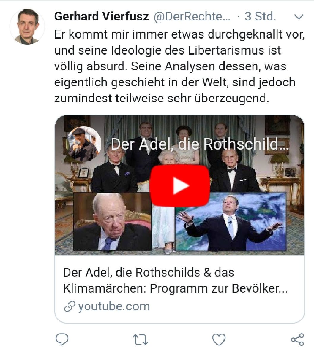 Diese Bezüge sind keineswegs zufällig. Vierfuß äußert sich in den sozialem Medien selbst antisemitisch, etwa indem er von einer vermeintlich „tragenden Rolle von Juden bei der Auflösung aller Dinge“ fantasiert und sich dabei auf den Antisemiten Kevin MacDonald bezieht. Auch raunt Vierfuß, man solle sich „den Anteil von Juden, die innerhalb der UN massiv für Migration eintreten“ anschauen. Wenig subtil wird hier die Verschwörungstheorie des „großen Austauschs“ genährt, nach der die „deutsche Bevölkerung“ gegen Geflüchtete ausgetauscht werden solle. Vermeintlich gesteuert von finsteren Mächten im Hintergrund, die Vierfuß hier offen benennt. Passend dazu teilt Gerhard Vierfuß via Twitter auch ein verschwörungsideologisches Video über den „Adel, die Rothschilds & das Klimamärchen“. Für Vierfuß „Analysen dessen, was eigentlich geschieht in der Welt“, die er „zumindest teilweise sehr überzeugend“ findet. Grundsätzlich ist Vierfuß der Ansicht, dass sich „Juden sich im Durchschnitt wesentlich weniger loyal verhalten als andere“.