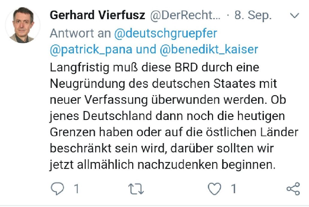 Vierfuß selbst verkündet bei Twitter: „Langfristig muss diese BRD durch eine Neugründung des deutschen Staates mit neuer Verfassung überwunden werden“. Wie ein solcher Staat aussehen würde, lässt sich leicht erahnen.