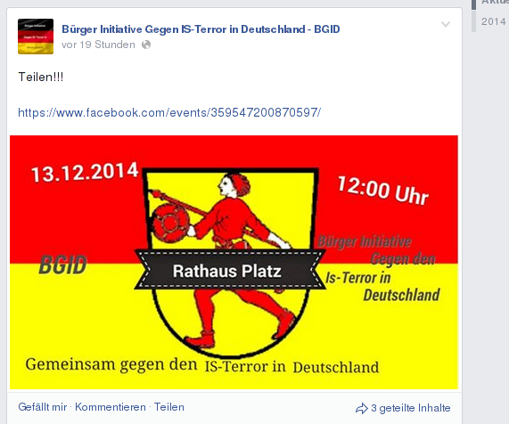 Für den 13.Dezember wird nun eine Demonstration einer selbsternannten „Bürger Initiative Gegen IS-Terror in Deutschland“ (Fehler im Original) in Wilhelmshaven beworben. Die Zusagen bei Facebook lassen auf eine ähnliche Klientel schließen wie zuletzt in Hannover oder Köln.