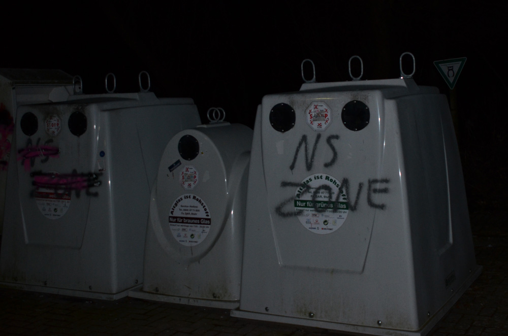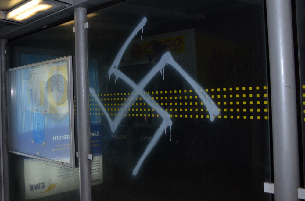 Außerdem wurden im Umkreis, beispielsweise am Bundeswehrgelände an der Dragoner Straße, weitere Hakenkreuze und nationalsozialistische Parolen gesprüht. Unter anderem war der Slogan „NS Zone“ zu lesen. Diese Losung wurde bereits im Zusammenhang mit dem Anschlag auf den jüdischen Friedhof im Jahre 2013 verwendet. Ebenfalls auffällig: Auch im direkten Umkreis des Wohnorts des langjährigen Oldenburger Neonazis Daniel Gawenda wurde diese Parole bereits an mehrere Altglascontainer gesprüht.