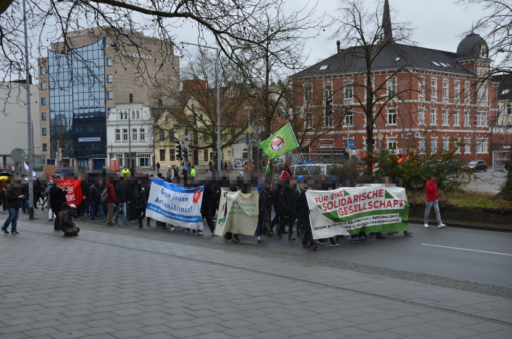 Auch einer der Mitorganisator_innen der antisemitischen und verschwörungsideologischen Oldenburger „Friedensmahnwachen“, Bernd Kahlen, nahm an der Bündnisdemonstration teil. Der Aufforderung zu gehen kam er umgehend nach.