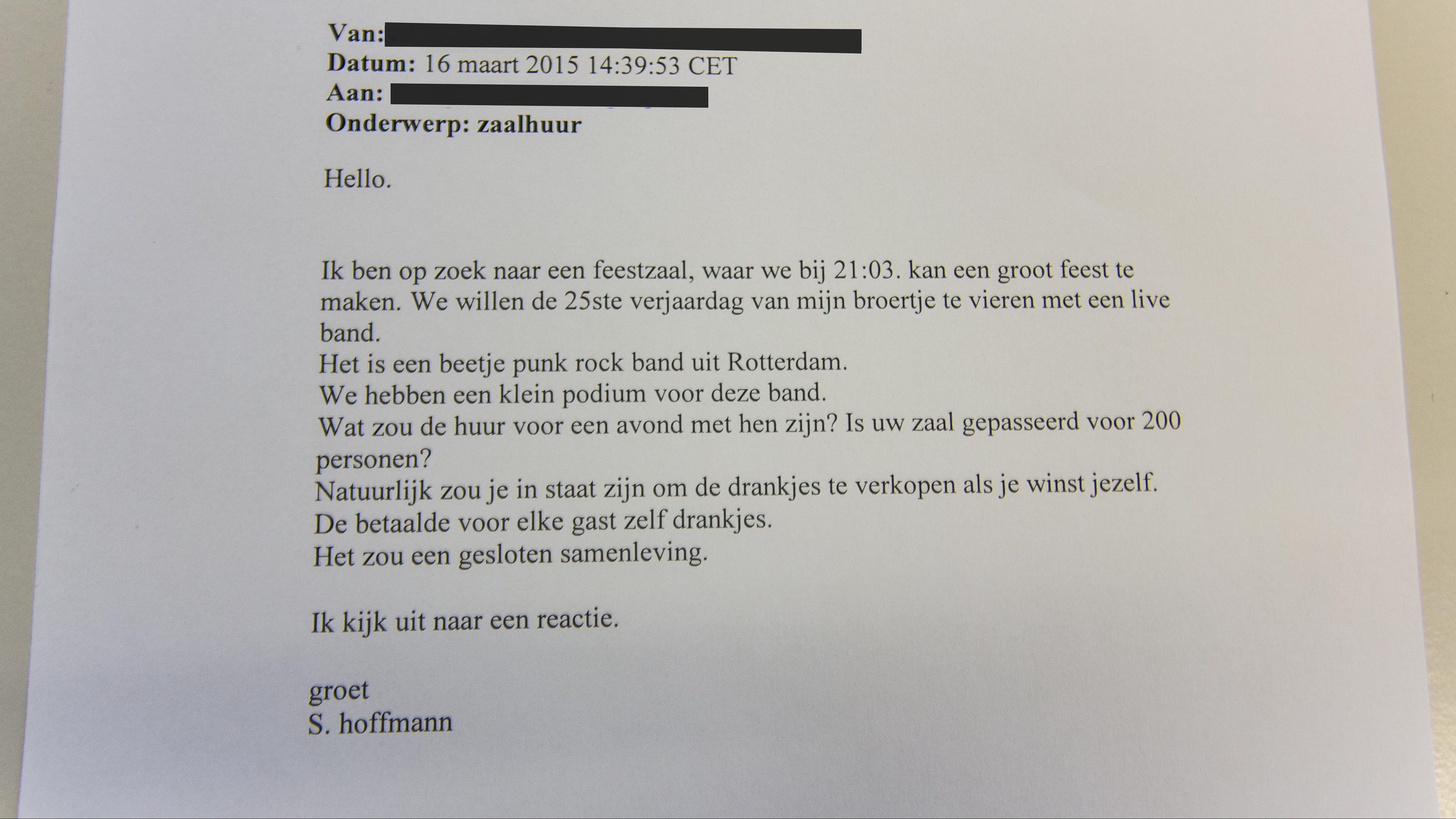 Lügenhools: Anfrage für einen Veranstaltungsraum in den Niederlanden mit der Ankündigung einer „Punk Rock Band“ aus Rotterdam