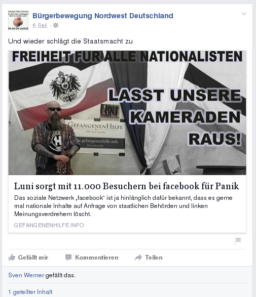 Kurze Zeit später ist jedoch eine weitere Facebook-Seite aufgetaucht: die sogenannte „Bürgerbewegung Nordwest Deutschland“. Da diese einen ähnlichen Duktus wie die zahlreichen anderen Websites von Mindrup hat, ist davon auszugehen, dass auch diese Seite von ihm betrieben wird.