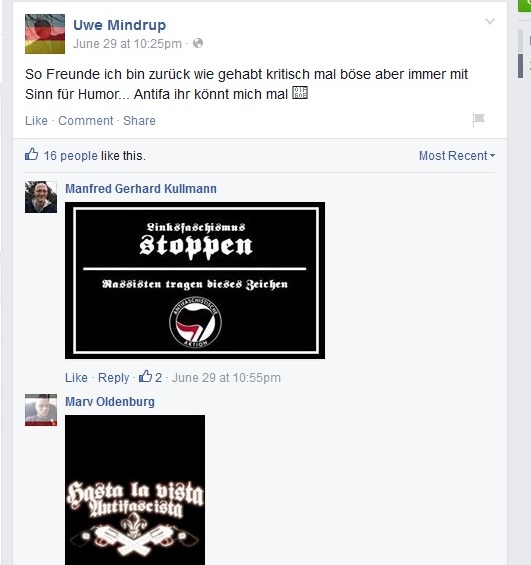 Auch wenn „Widerstand Oldenburg“ bereits nach wenigen Wochen wieder Geschichte ist und keinerlei Aktivitäten entfalten konnte, haben wir es mit Uwe Mindrup mit einem geltungsbedürftigen und weiterhin aktiven Fanatiker zu tun. Im Windschatten patriotischer Wutbürger*innen betreibt er „Anti-Antifa“-Arbeit und stellt damit eine potentielle Gefahr für seine Feindbilder dar. Er sympathisiert mit dem Rocker- und Hooliganmilieu, auch wenn reelle Kontakte aktuell in Oldenburg bislang nicht beobachtet werden können.