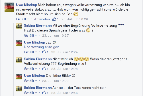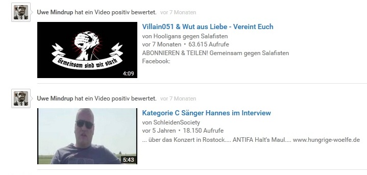 Ansonsten macht der geltungsbedürftige Kioskbesitzer auch keinen Hehl aus seinen Sympathien für Neonazis, wie beispielsweise für den Sänger der Neonazi-Hooligan-Band „Kategorie C“ Hannes Ostendorf. Auch der Neonazi-Musiker „Vilain051“ gefällt Uwe Mindrup. Sein wahnhafter Hass gegen Antifaschist*innen, welcher häufig in Gewaltandrohungen mündet, ist ein weiteres Charakteristikum für ein neonazistisches Weltbild. Mindrups Ideologie, gepaart mit seinem Geltungsbedürfnis, führte dann auch schlussendlich zu einer Verurteilung wegen Volksverhetzung. Ein Urteil, auf das Mindrup nach eigenen Angaben stolz ist.
