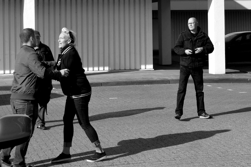 Daniela Bliesener bei dem Versuch, Antifaschist*innen anzugreifen