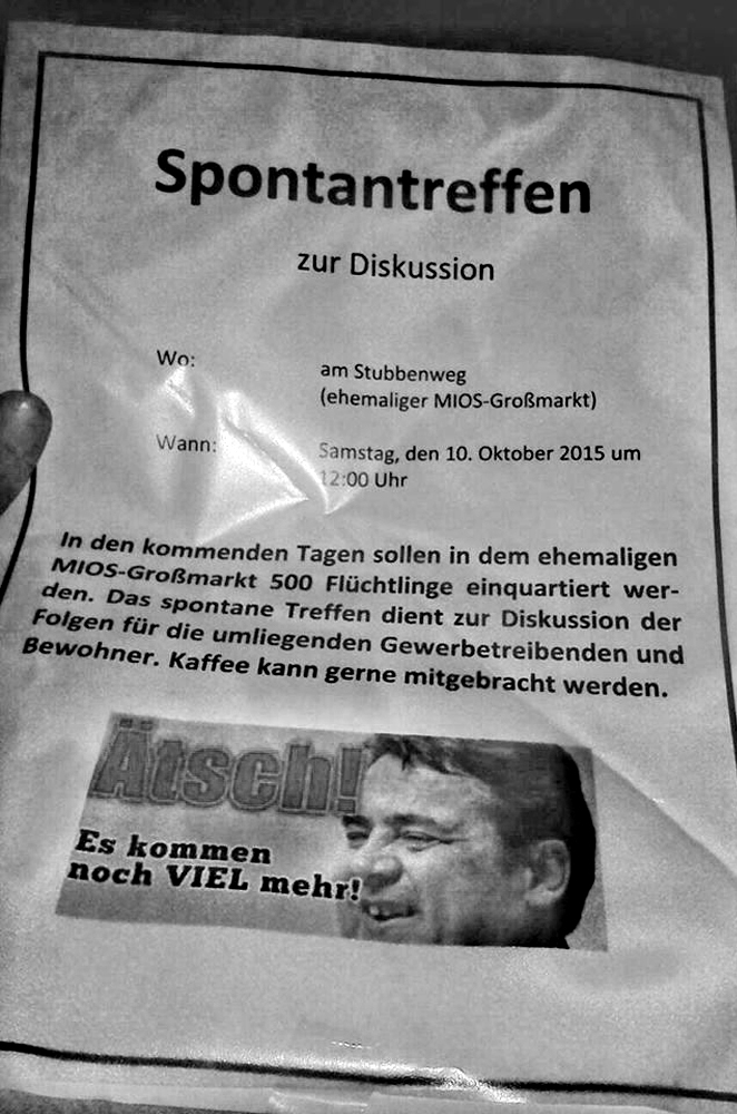 Nachdem kurzfristig bekannt wurde, dass in Oldenburg-Etzhorn eine Unterkunft für ca. 500 Geflüchtete entstehen soll, tauchten im Stadtteil Plakate auf, die zu einem „Spontantreffen zur Diskussion“ am Samstag Mittag aufriefen. Die inhaltliche Schwerpunktsetzung (es sollten die „Folgen für die umliegenden Gewerbetreibenden und Anwohner“ diskutiert werden) ließ schon im Vorfeld darauf schließen, dass dieser Aufruf aus der Neonaziszene kommt, getarnt als Diskussionsrunde für Anwohner*innen.