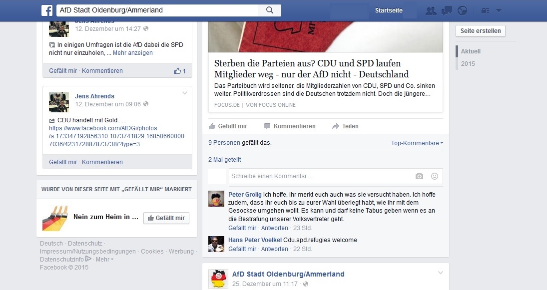 Ein weiteres Internetphänomen: „Besorgte Bürger*innen“ überbieten sich momentan darin, immer neue Facebookseiten mit immer gewichtigeren Gruppennamen zu gründen, die eine breite Bewegung vortäuschen sollen. Bestes Beispiel ist die Seite „Patriotischer Widerstand Deutschland“, der sich aus einer kleinen Gruppe Wilhelmshavener Rassist*innen zusammensetzt.