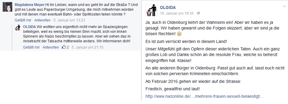 Auf seiner Facebookseite kündigt der Oldenburger PEGIDA-Ableger „OLGIDA“ an, im Februar wieder auf die Straße zu gehen. Bereits im März vergangenen Jahres scheiterten zwei Versuche, in Oldenburg auf die Straße zu gehen, am entschlossenen Protest mehrerer hundert Antifaschist*innen. OLGIDA kam keinen Meter weit. Seit dem folgten interne Differenzen innerhalb des damals dreiköpfigen Organisationsteams, leere Ankündigungen neuer Kundgebungen sowie eine zwischenzeitliche Auszeit der Facebookseite. Ob OLGIDA um Organisatorin Sabina Eiermann aus ostfriesischen Bunde nun in der Lage sein wird, erneut einen Versuch zu wagen, auf die Straße zu gehen, bleibt abzuwarten.
