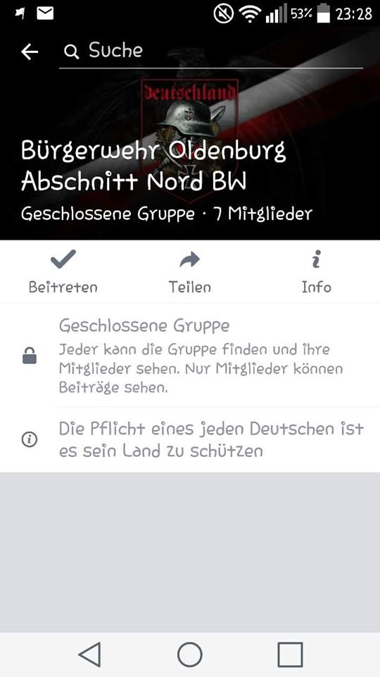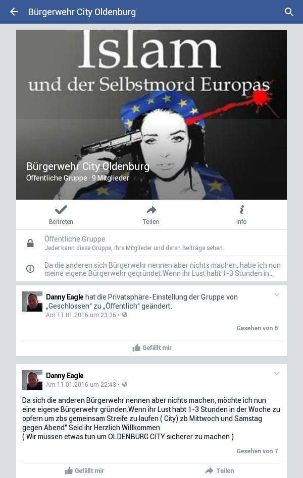 Schon länger existiert die Facebookgruppe „Bürgerwehr Oldenburg Abschnitt Nord BW“, seit kurzem umbenannt in „Bürgerwehr Oldenburg – gegenseitig helfen“. Dort sammeln sich bekannte Neonazis und Rassist*innen wie Jens Malte Hillers, Daniela Bliesener, Eckhard Aden, Daniel Gawenda, Olaf Dielefeld und Joachim Köpsel. Einer der drei Administratoren, Jörg Meister, ist schon als PEGIDA-Sympathisant aufgefallen.