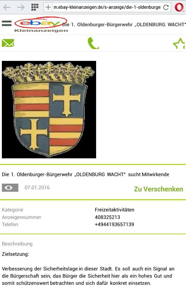 Die Oldenburger Bürgerwehr „Oldenburg wacht“ warb bis vor kurzem über das Portal „eBay Kleinanzeigen“ um neue Mitstreiter*innen. In dem dortigen Text ist von „Bestreifungen […] an den Örtlichkeiten der Innenstadt sowie an den bekannten Brennpunkten“ die Rede. Zwar wird in dem Text auf eine vermeintliche Neutralität verwiesen und es wird sich auch in bester extremismustheoretischer Manier von „links- und rechtsradikalem Lager“ distanziert, an Hand des Sprachgebrauchs erscheint es trotzdem schnell ersichtlich, mit welchem Gedankengut die Initiator*innen der „Bürgerwehr“ sympathisieren. So ist im klassischen nationalsozialistischen Vokabular von „Denunzianten, Unruhestiftern und anderweitige[n] asoziale[n] Gestalten“ die Rede.