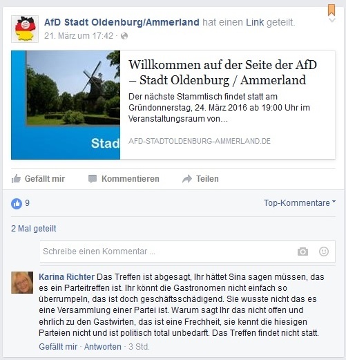 Am Donnerstag, 24. März, versuchte der lokale Ableger der Afd „Stadt Oldenburg/Ammerland“ seinen regelmäßigen Stammtisch in einem Lokal an der Stedinger Straße in Oldenburg-Osternburg durchzuführen. Thema des Abends: „Eine Alternative für das ganze Volk – wie wird die Afd zur bestimmenden politischen Kraft in Deutschland?“