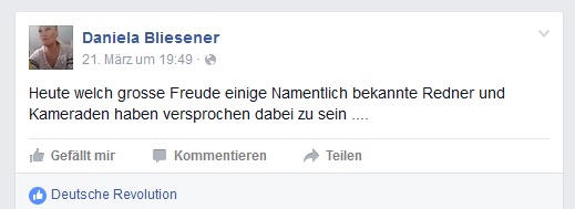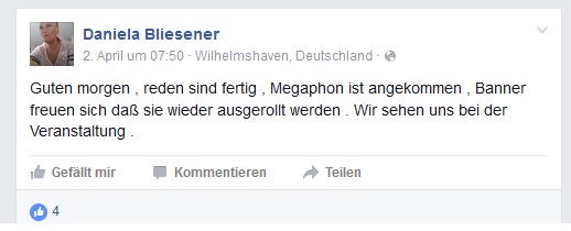 Die Neonazi-Aktivistin Daniela Bliesener aus Schortens-Roffhausen, die im Vorfeld in sozialen Netzwerken für die Kundgebung geworben hat, stieg nicht mal aus ihrem Fahrzeug aus. Letztlich fand keine Kundgebung statt. Nach einer halben Stunde verließen die anwesenden Neonazis den Ort des Geschehens unverrichteter Dinge. Die im Vorfeld angekündigten „namhaften Redner“ und Transparente gab es nicht.
