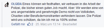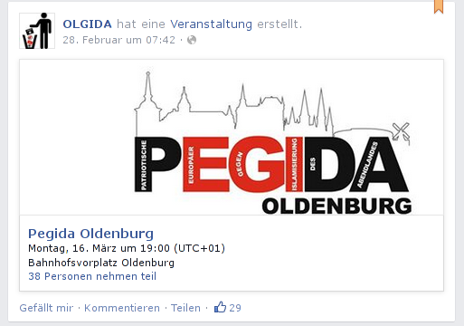 OLGIDA selbst äußert sich noch nicht konkret zu der aktuellen Situation, sondern lässt zweideutig verlautbaren: „die Oldenburger Polizei sieht sich nicht im Stande die Demonstration der Pegida Oldenburg umfassend bei einem Spaziergang zu schützen!!!!!!!!“ [Anzahl der Ausrufezeichen im Original, d.Red.] […] Wir werden eine von uns angemeldete und genehmigte Demo nicht von Vollidioten, Chaoten oder Berufsdemonstranten verhindern lassen. Die Polizei wird uns schützen, da bin ich mir zu 100% sicher.“. Hier soll offenbar das Bild vermittelt werden, dass der geplante Marsch durch Oldenburg stattfinden soll. Besagtes Posting stammt allerdings vom 25.März. Wahrscheinlich ist es, dass danach seitens der Behörden keine Genehmigung für eine Demonstration erfolgte, sondern nur für eine Kundgebung.