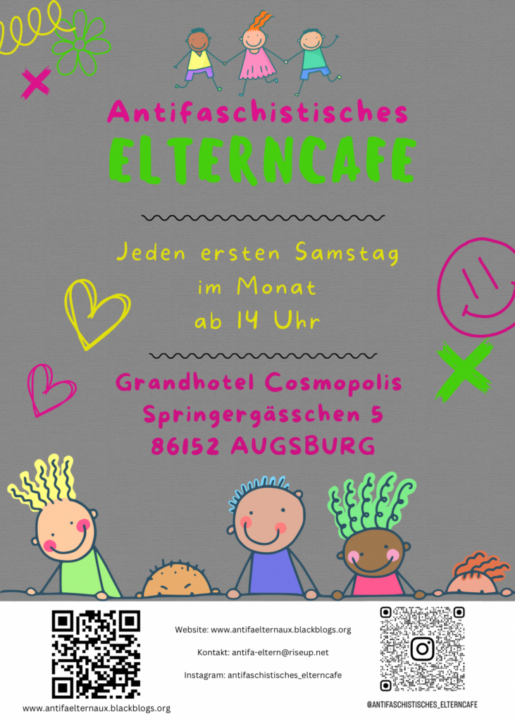 Das antifaschistische Elterncafé bietet Eltern oder anderen Sorgeberechtigten und ihren Kindern einmal im Monat die Möglichkeit, sich bei einer Tasse Kaffee oder Kakao auszutauschen, sich kennen zu lernen und gemeinsam ins Gespräch zu kommen. Es soll ein sicherer Raum geschaffen werden um sich über verschiedenste Themen rund um Elternschaft und Aktivismus auszutauschen. Immer beim Café dabei: eine Betreuung und kleines Spielangebot für Kinder ab 3 Jahren.