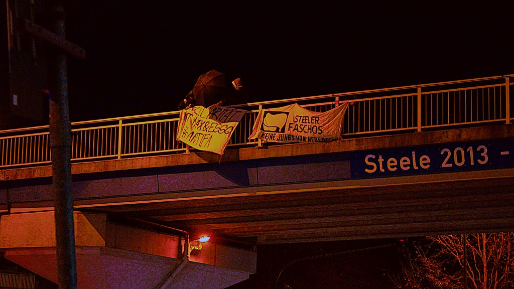 Aufruf: Seit über einem Jahr „spazieren“ die selbsternannten Steeler Jungs jeden Donnerstag durch Essen Steele und versuchen ein Drohszenario gegen Migrant*innen und Andersdenkende zu erzeugen. Dabei handelt es sich größtenteils um Macker, die sich aus dem rechtsradikalen und gewalttätigen Hooliganmilieu rekrutieren. Führende Kraft ist der Ex-MMA-Kämpfer „Bifi-Chris“. Er ist der Kopf der Bottroper Bandidos und Leiter der rechten Kneipe 300, sowie dem Umzugsunternehmen Willing in Steele.