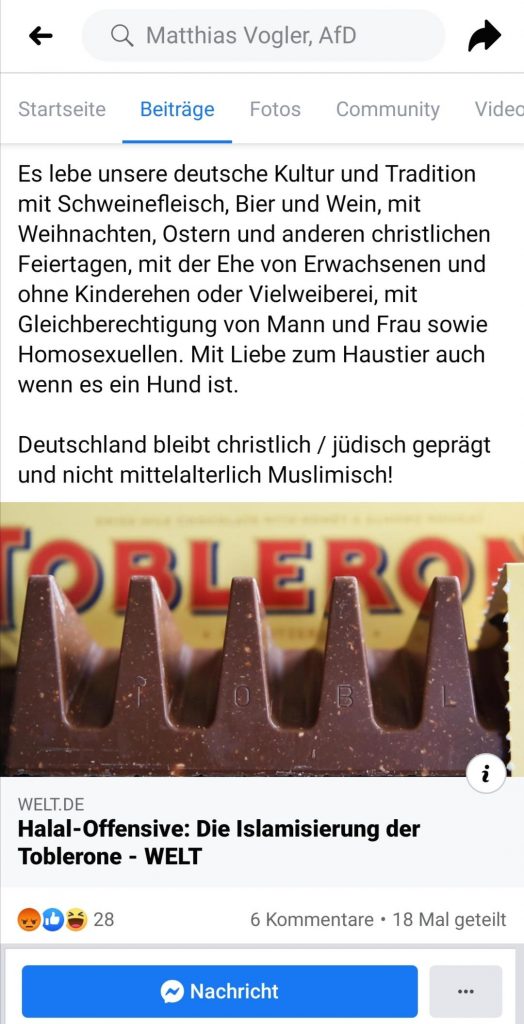 Toblerone thematisierte, offensichtlich, ohne auch nur den ersten Absatz dessen gelesen zu haben, um reißerisch zu behaupten: „Damit die Muslime auch diese essen können werden halt die Tiere gequält um halal zu sein.“. Wer sich die Inhaltsangabe von Toblerone schon einmal angesehen hat, könnte hier ins Stocken geraten, denn Fleisch (angenommen Vogler bezieht sich, wie viele seiner GesinnungsfreundInnen, auf das Schächten von Tieren, welches eine Voraussetzung ist, dieses als koscher oder halal bezeichnen zu können) ist in Schokolade gar nicht enthalten. Auch der Autor des Artikels, der hier so vorschnell geteilt wurde, erklärt bereits im ersten Absatz, dass keine der Zutaten verändert werden musste, um zertifiziert zu werden. Skandalisierung ohne materielle Grundlage, dafür mit einem guten Schuss Rassismus, scheint seine Aktivitäten in den Sozialen Medien gut zu beschreiben.