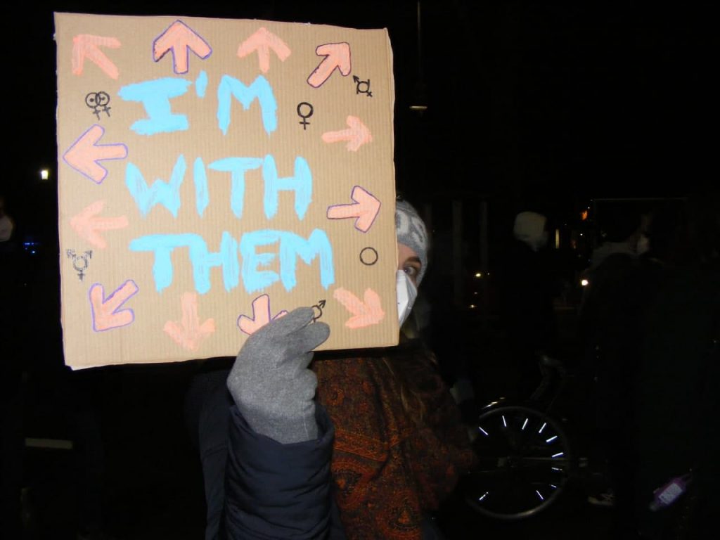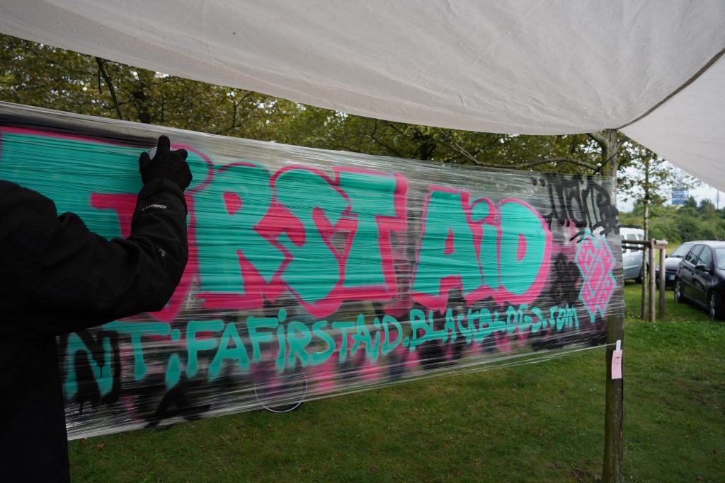 Da das Private bekanntlich politisch ist, freuen wir uns an dieser Stelle sehr, dass die von uns organisierte Kinderbetreuung nicht allein an weiblich sozialisierten Genossinnen hängen blieb und zum großen Teil von männlich sozialisierten Gruppenmitgliedern übernommen wurde. Ausgerüstet mit Trampolin, Seifenblasen und Fußbällen wurde (nicht nur) den Kindern einiges geboten. Kreativ entfalten konnten sie sich mit Blatt und Stift oder mit Sprühdosen an einer temporären Graffiti-Wand aus Klarsichtfolie. Wir fordern: Gerechte Aufteilung von Care- und Sorgearbeit!