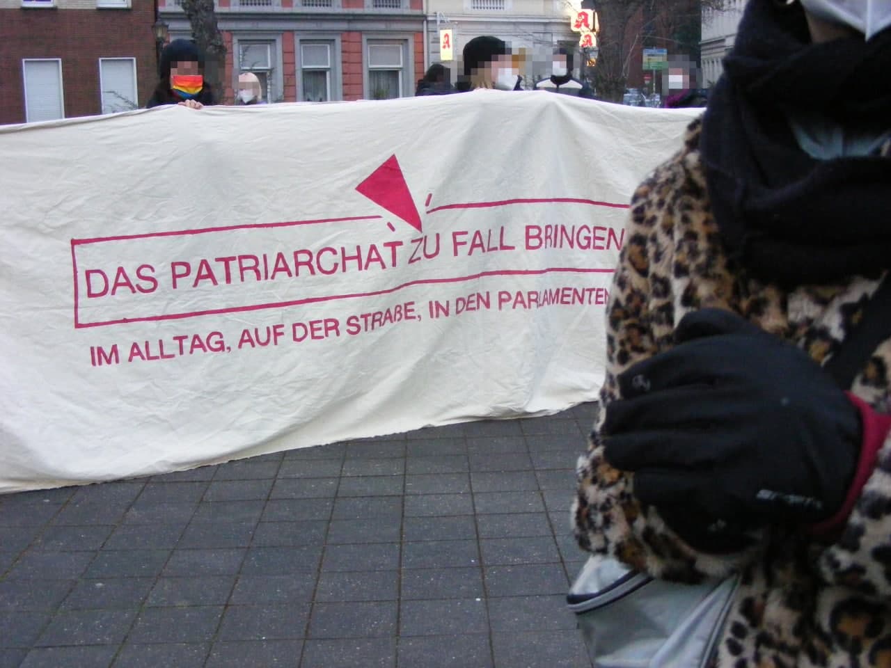 Ein Transparent mit der Aufschrift “Das Patriarchat zu Fall bringen. Im Alltag, auf der Straße, in den Parlamenten!”