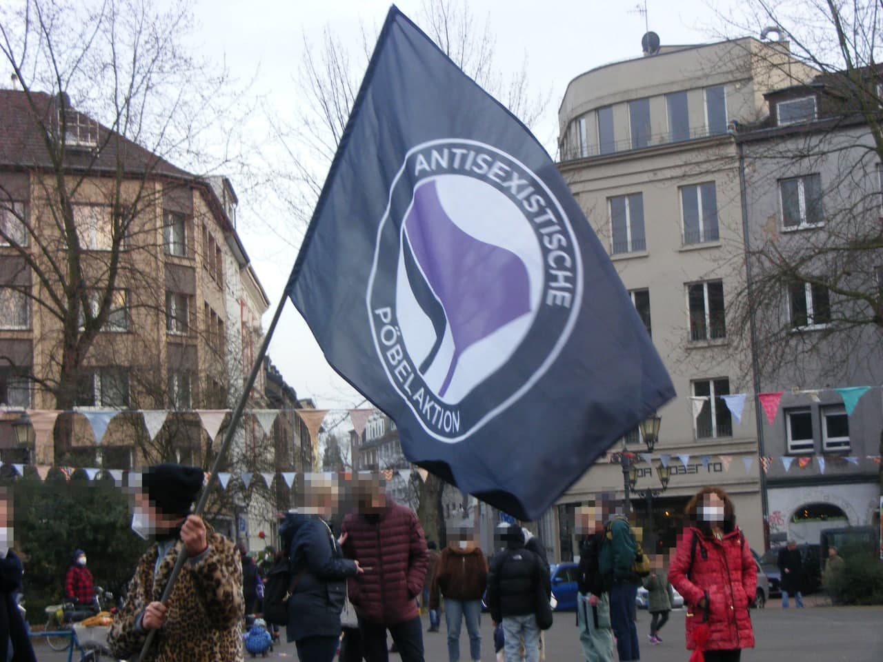 Eine Person hält ein Fahne mit dem Logo der “Antisexistischen Pöbelaktion”
