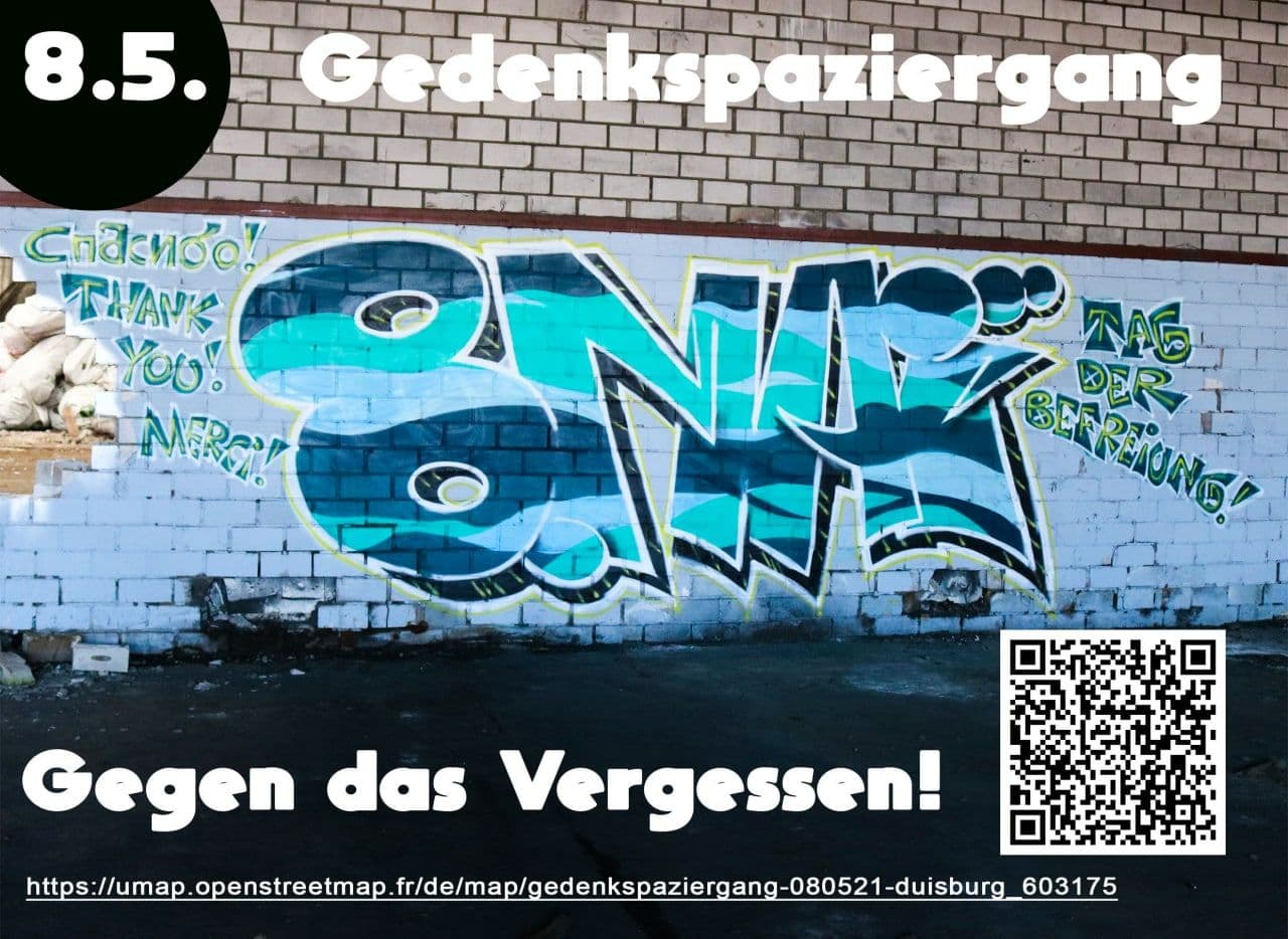 Sharepic mit Graffiti “8. Mai – Tag der Befreiung” und dem Text “Gedenkspaziergang gegen das Vergessen”