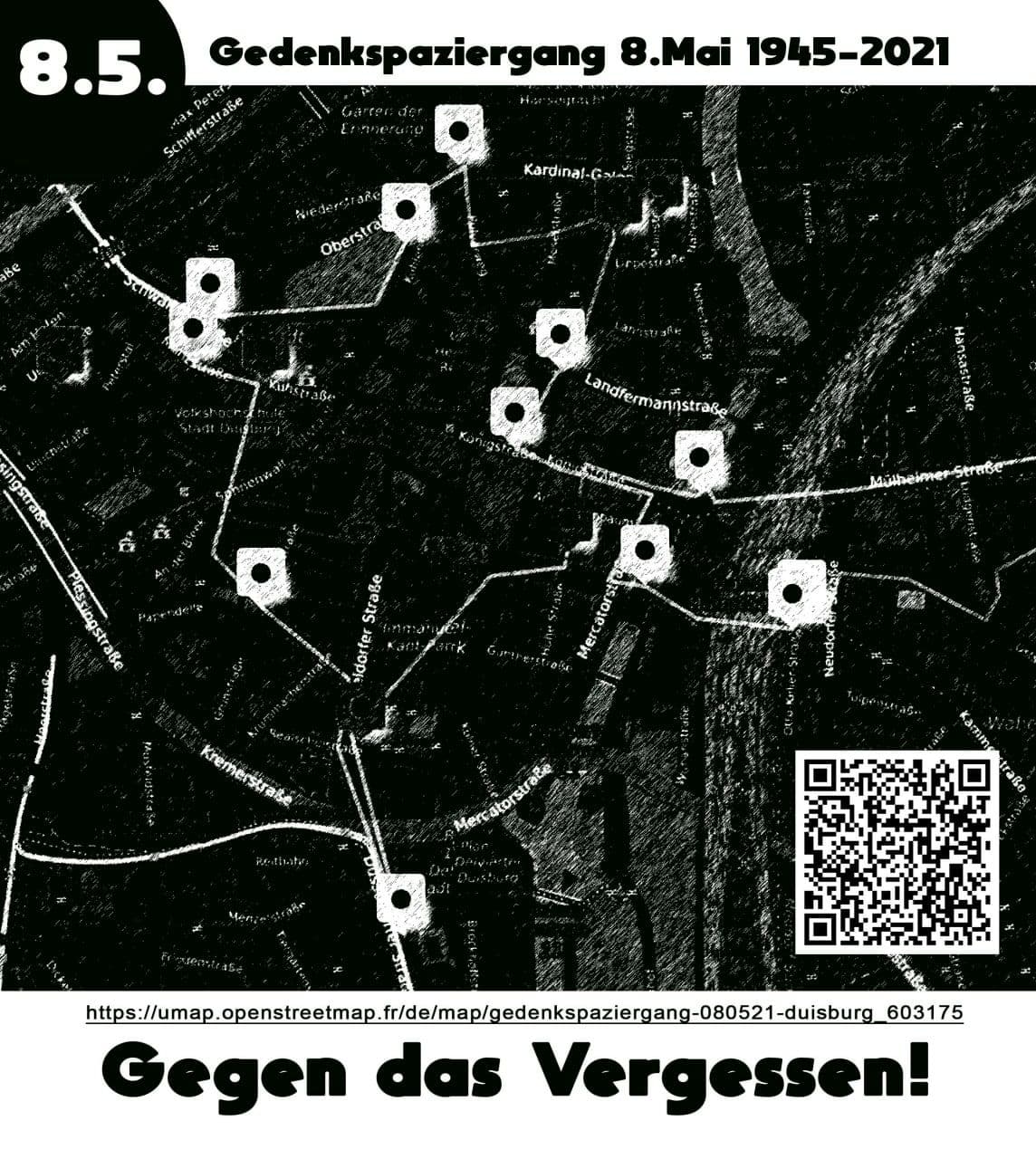 Nach einer Umfrage wissen 45 % der deutschen Bundesbürger*innen nicht was am 8. Mai 1945 passiert ist. Weißt du es? Falls nicht, kein Problem! Deine Wissenslücke lässt sich leicht schließen. Begebe Dich dafür auf unseren Covid-19 konformen Gedenkspaziergang und erlebe das Duisburger Stadtbild einmal unter einem anderen Blickwinkel.