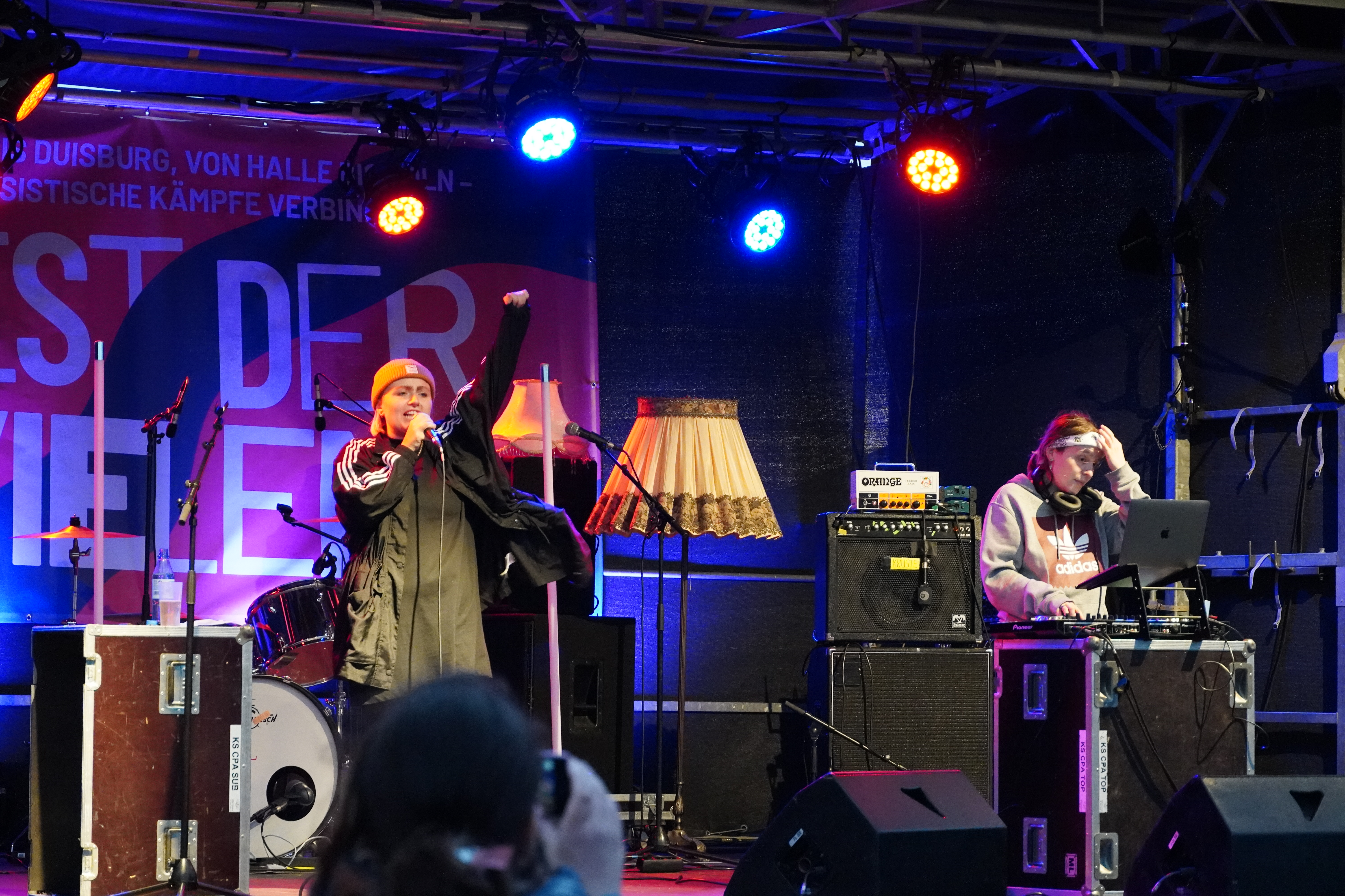 Abschließend sorgten sechs Musikacts für einen kraftvollen Ausklang des Abends. Neben Alex X-tra ta aus Duisburg-Hochfeld, Gürsoy Tanç, Tenor und Kruste aus Duisburg sowie der Microphone Mafia aus Köln überzeugte die Rapperin “Mino Riot” (Saarbrücken/Duisburg) mit ihrer Forderung, die Fesseln des Patriarchats zu zersprengen. Dem können wir uns nur anschließen und bedanken uns für diesen empowernden Auftritt!
