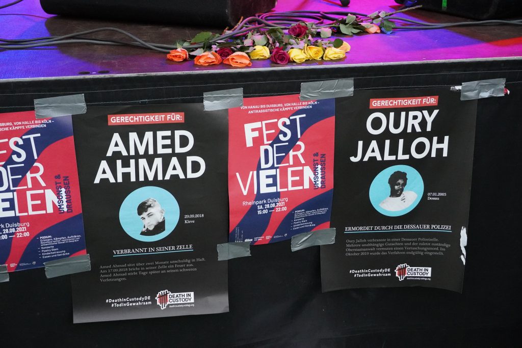 Im Anschluss performten die Künstler:innen und Poetry-Slammer:innen Abdul Kader Chahin und Lisa Brück unter anderem ihren gemeinsamen Text “Anklage – in memoriam Oury Jalloh”: “[…] diesen Mördern das Feld nicht überlassen. Wir sind es Oury schuldig. Dieser Mord muss aufgeklärt werden. Es muss Gerechtigkeit walten. Die Politik und Justiz müssen ihren Amtseid halten. Unsere Demokratie ist nichts wert wenn sie die Täter:innen auf freiem Fuß lassen. Ihr seid nicht unschuldig und euer Schweigen kann euch nicht frei machen. Was geht euch durch den Kopf, wenn ihr euch klar macht, wie weit Rassismus gehen kann. […] Was geht euch durch den Kopf, wenn der Faschismus getarnt als Einzelfall keine gerechte Konsequenz bekommt. Es liegt in unserer Hand, ob Oury umsonst gestorben ist. Nichts macht es wieder gut, aber wenn sein Tod die Wurzel des Elends endlich raus reißt, rettet das wenigstens andere Menschenleben. Das wenigste wäre auch Gerechtigkeit für die Zukunft, aber am meisten für Oury. Das geht auch nicht nur durch den Kopf, sondern vor allem mit Herz.”