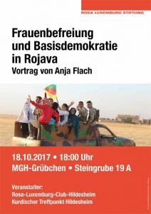 Am 18.10 kommt Anja Flach nach Hildesheim. Sie war als eine der ersten deutschen Internationalist*innen in einer der ersten Frauenarmeen aktiv und hat gegen den Faschismus und das Patriarchat gekämpft. Auch in Deutschland ist sie weiter in der kurdischen Bewegung aktiv und wird in Hildesheim darüber berichten, wie die Frauenbereiung und der demokratische Konföderalismus in Rojava (Kurdistan) voran gehen.