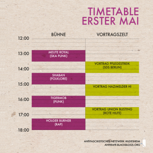 Bizler Antifaschistisches Netzwerk Hildesheim, 1 Mayıs vesilesiyle Steingrube’de „1 Mayıs! Dayanışma, Mücadele, Feminizm” şiarıyla işçi bayramını kutlamak istiyoruz. Herkesi 1 Mayıs günü, DGB-Hildesheim’in saat 11:00,da Tren istasyonu önünde başlayacak olan yürüyüşünde, Entarnasyonal Blokta yer almaya çağırıyoruz! Sokaktaki Taleplerimizin yanı sıra, Steingrube Hildesheim’de kültürlerarası Müzik-Programı, Atölye çalışmaları, Bilgi standları, Seminerler ve Enternasyonal yemekler var. Çocuklarında oynayabileceği çeşitli oyunlarda olacak. Daha fazla bilgi için İnternet-Sayfamızı ziyaret edebilirsiniz.