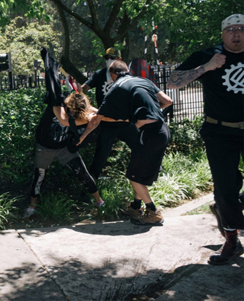 These are dangerous individuals and these relationships pose a threat to our community. We know this because of the events of June 26th, 2016, when 400 anti racist protesters prevented neo-Nazis of the Golden State Skinheads (GSS) and the now defunct Traditionalist Worker Party (TWP) from having a rally at the state capitol in Sacramento. Multiple melees ensued after the protesters successfully denied the neo-Nazis a platform that day and eventually 9 anti racist protesters were hospitalized: six due to stab wounds and 3 due to blunt force trauma. In the photo below, Jason Judd is wearing the green and yellow Border Patrol hat. He is holding an anti-racist protester while Sean Wurzburg stabs her in the abdomen. Joshua O’Leary is clearly in the forefront, fists raised, heading into the fray. Since these events, Nicole Wallace has clearly connected with both Judd and O’Leary as confirmed in the previous photo.