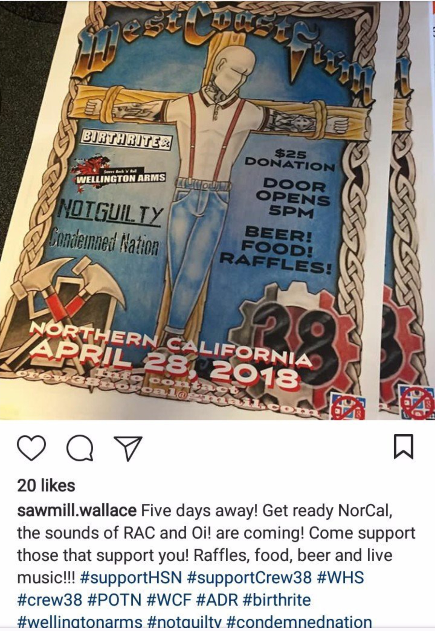 Hammerskins pose a direct threat to people wherever they gather. And Joshua Wallace is no exception. In the spring of 2018, Joshua Wallace was promoting a large white power concert that was sponsored by Hammerskins and Crew 38. Crew 38 is another white supremacist group that serves as a feeder group to Hammerskins around the country. The concert itself was organized by the “West Coast Firm,” a group consisting of members of the Hammerskins and their supporters on the west coast. For years they have been working together to organize concerts which serve as recruitment efforts and networking events for white supremacists, as seen in the image below, posted by Joshua Wallace on Instagram.