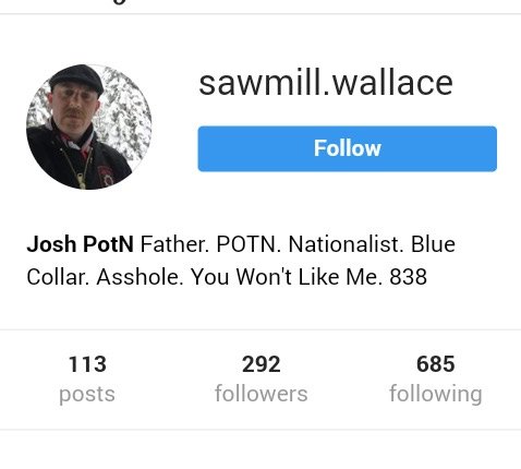 The most recent screenshot of Wallace’s Instagram profile below shows him using the acronym “WHS” which stands for Western Hammerskins. They are one of the six chapters of the Hammerskin Nation active in the U.S. This means then that in the last year Wallace has graduated from being a prospect to a full blown a member of the Western Hammerskins.