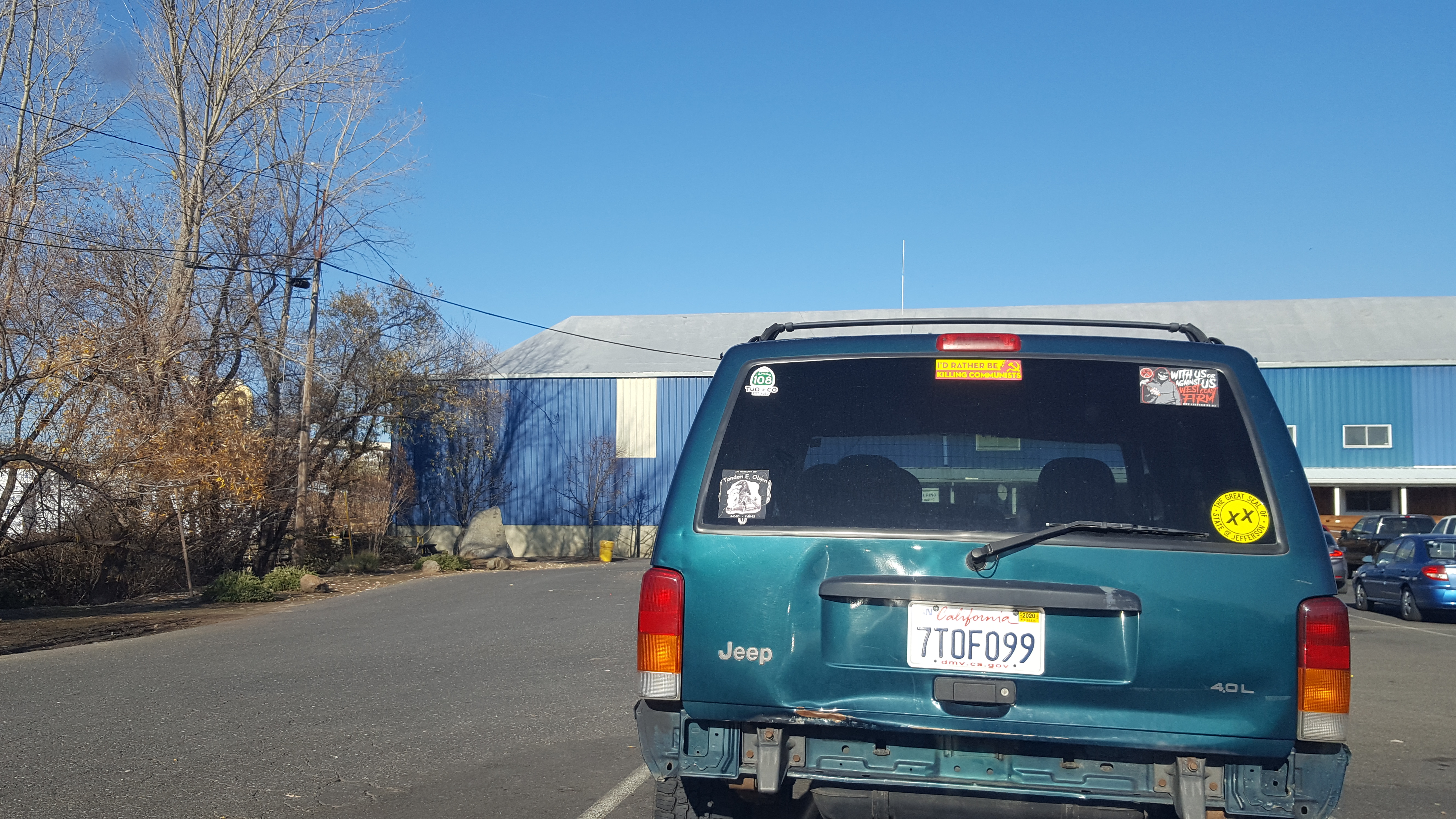 Vehicle – green Jeep with a missing rear bumper – CA license plate 7TOF099