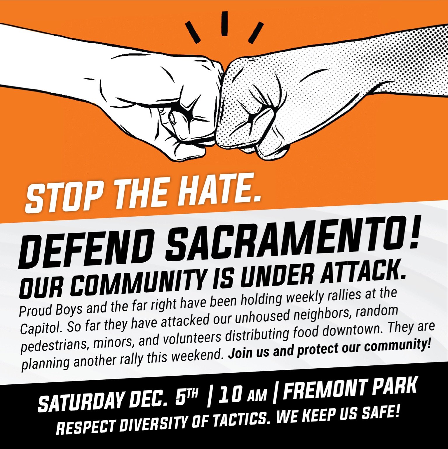We, the undersigned organizations of Sacramento and the Northern California area, condemn these rallies and call upon our members and our greater community to stand up against far-right violence and bigotry on Saturday, December 5th, 10 am, at Fremont Park.