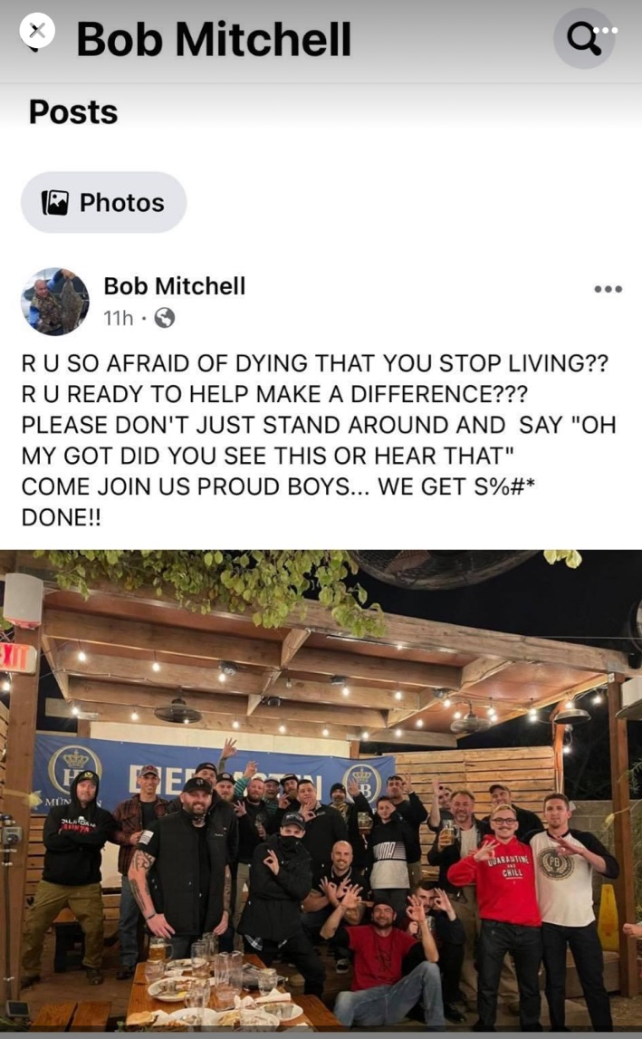 In this post, Bob Mitchell calls on his Facebook friends to join the Proud Boys, sharing a photo featuring a gathering of local Proud Boys and urging his followers to “Join us Proud Boys” and “get s%#* done!!” further cementing his ties to the organization and his interest in recruiting others to spread hatred and bigotry.