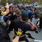 On November 28th, “Stop the Steal” rally-goers marched to Cesar Chavez park yet again. While their numbers were smaller than the previous week, many of them downed hard alcohol prior to marching. Intoxicated, determined, and full of rage, the rally-goers pushed past cops who tried to impede their progress to the park. However, the cops quickly cleared out soon after the rally-goers reached the park. Proud Boys could also be heard on livestreams that day talking openly about their desire to attack people. At one point, a livestreamer was heard saying, “We just want a civil discourse. We don’t want to hurt anyone.” A Proud Boy interjected, “I do!” Proud Boys were also heard talking about wanting to get their “4th degree,” which is earned by engaging in physical combat with or otherwise harming their opposition.