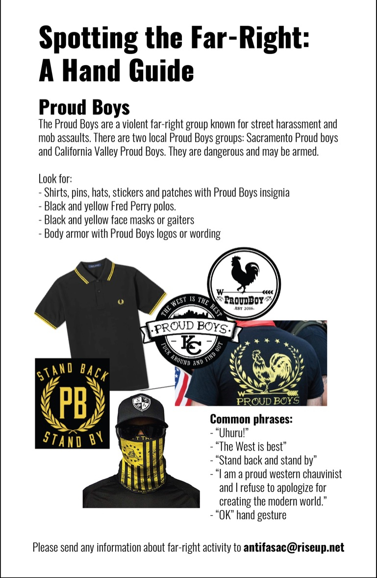 Below is a visual guide to common symbols, clothing, and dog whistles used by Proud Boys. Use it as a reference in helping to identify them, and share it around so everyone knows exactly what to look out for.