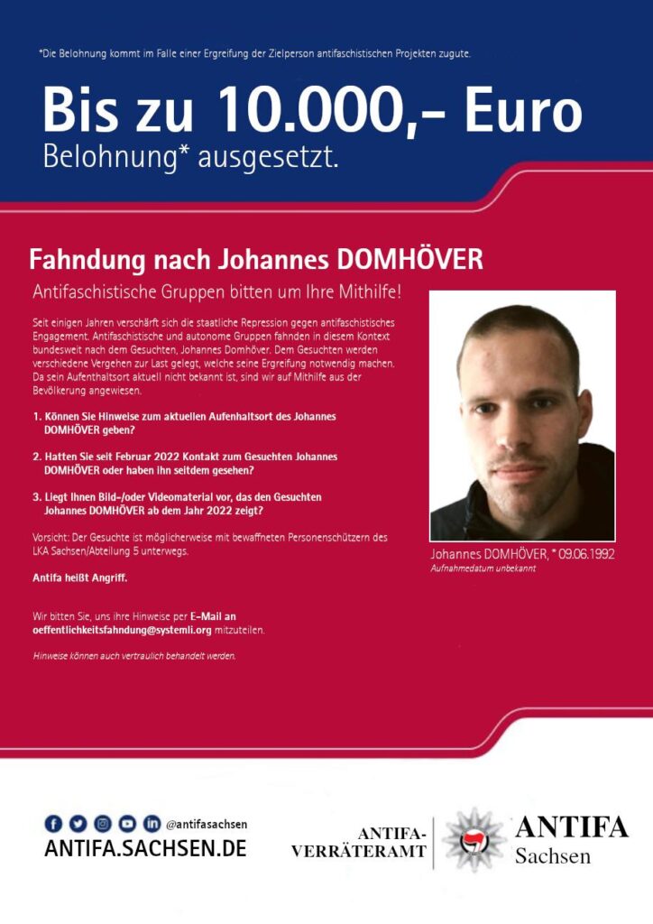 Um auf diese Fahndung zu reagieren, haben wir uns entschlossen, eine eigene Öffentlichkeitsfahndung nach Johannes Domhöver zu starten. Wir rufen dazu auf, die Plakate zu drucken, zu verbreiten und überall zu plakatieren. Insbesondere rufen wir dazu auf, die laufende Fahndung von BKA, LKA und Generalbundesanwalt zu sabotieren und die von uns entworfenen Plakate an ihrer Stelle anzubringen. Als Angriffsziel hervorzuheben ist der Werbekonzern Ströer, welcher auf 2×3 Metern neben Hauptstraßen und im 30 Sekunden-Takt auf den Werbedisplays in Bahnhöfen das Foto des Genossen verbreitet.