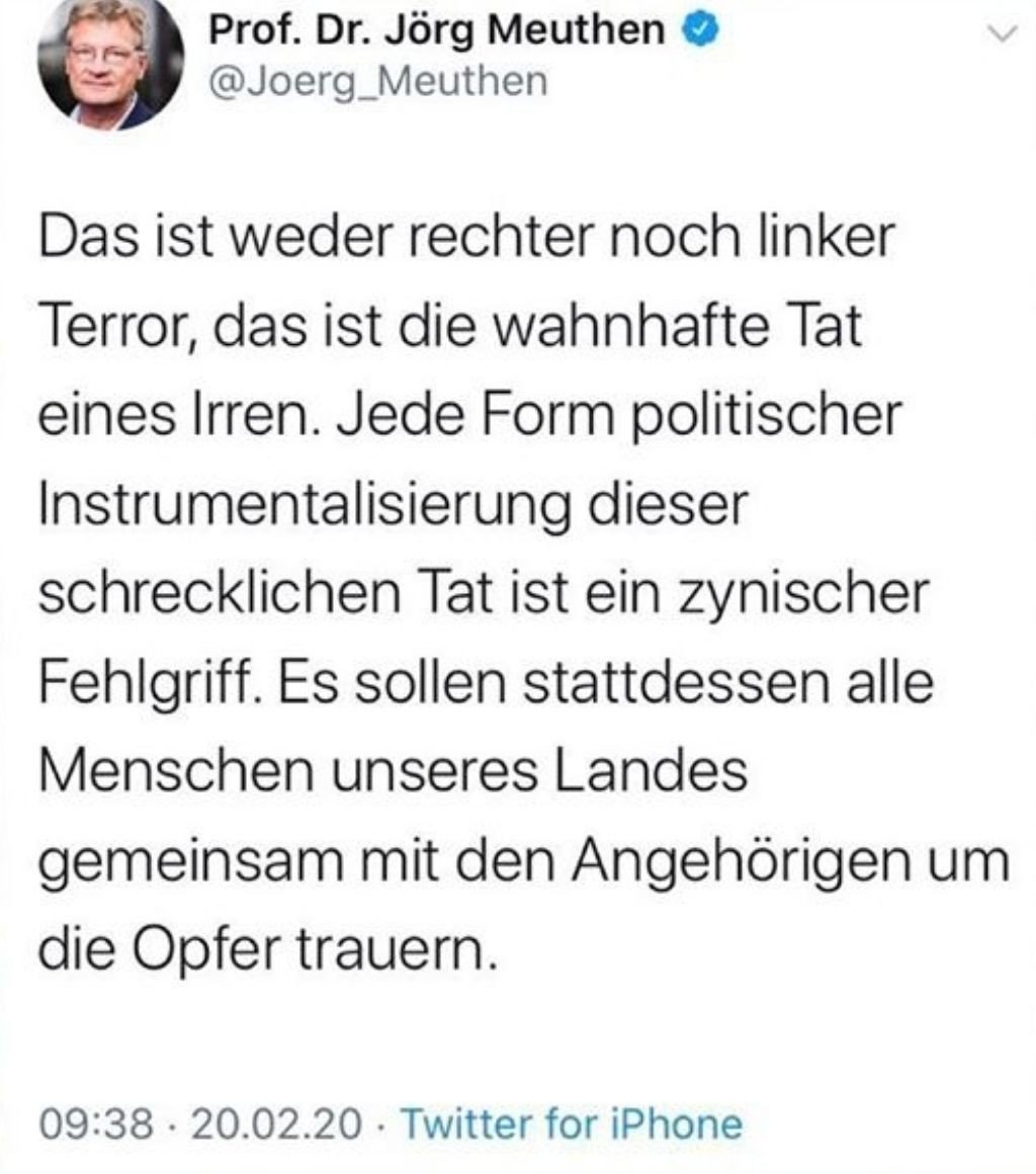 Es ist mittlerweile offensichtlich, dass sich rechte Menschen und Gruppierungen, im nach rechts rückenden gesellschaftlichen Klima, immer wohler und unangefochtener fühlen, wenn sie ihre Hetze in Taten umsetzen. Die faschistische Partei AfD verbreitet täglich rassistisches, fremdenfeindliches Gedankengut und ruft immer offener zu solchen Taten auf. Politiker*innen wie Hans-Georg Maaßen oder Jörg Meuthen relativieren auf übelste Weise diesen Anschlag.