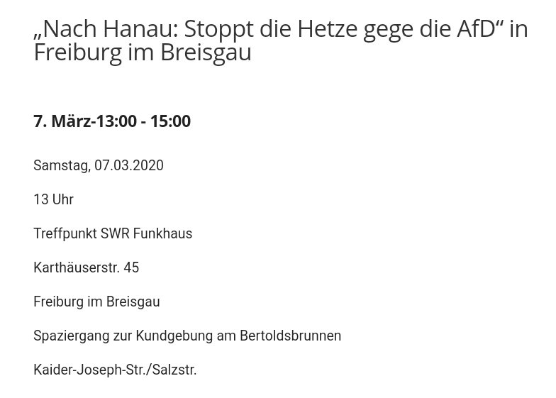 Nachdem Nazis in Freiburg sich vor ihrer widerwärtigen Idee einer „Nach Hanau: Stoppt die Hetze gegen die AfD„-Demonstration am 7. März wieder abgewendet hatten, wurde jetzt von Seiten der AfD eine Kundgebung zu der Gemeinderatssitzung am 3. März auf dem Rathausplatz angemeldet. Grund dafür ist die Umbenennung einiger Straßen.