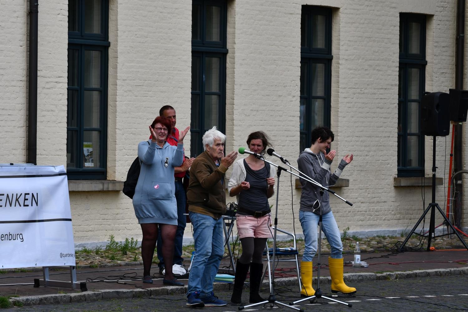 Der „Trommelzug“ zog derweil feixend und klatschend an den verletzten und festgesetzten Antifaschist*innen vorbei, was in Kontrast zu ihrer propagierten Friedliebigkeit und der lautstark eingeforderten Menschenwürde steht. Ihren lediglich 15 minütigen „Trommelzug“ konnten die Verschwörungsgläubigen dank der erfolgten Polizeigewalt weitgehend ungestört beenden, auch, wenn bereits beim Start der Kundgebung um 14:30 Uhr die wenigsten Teilnehmer*innen einen Mund- und Nasenschutz trugen oder den Mindestabstand zueinander oder zu den Gegenprotesten einhielten.