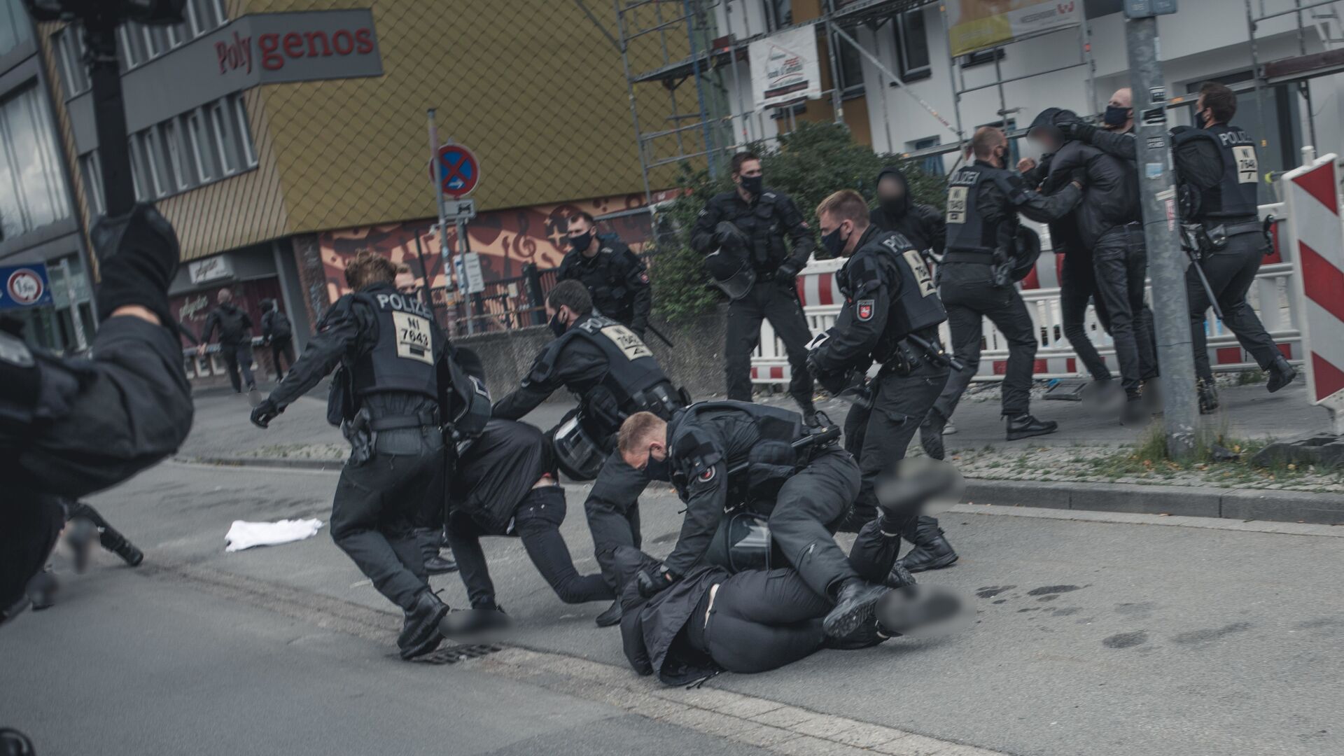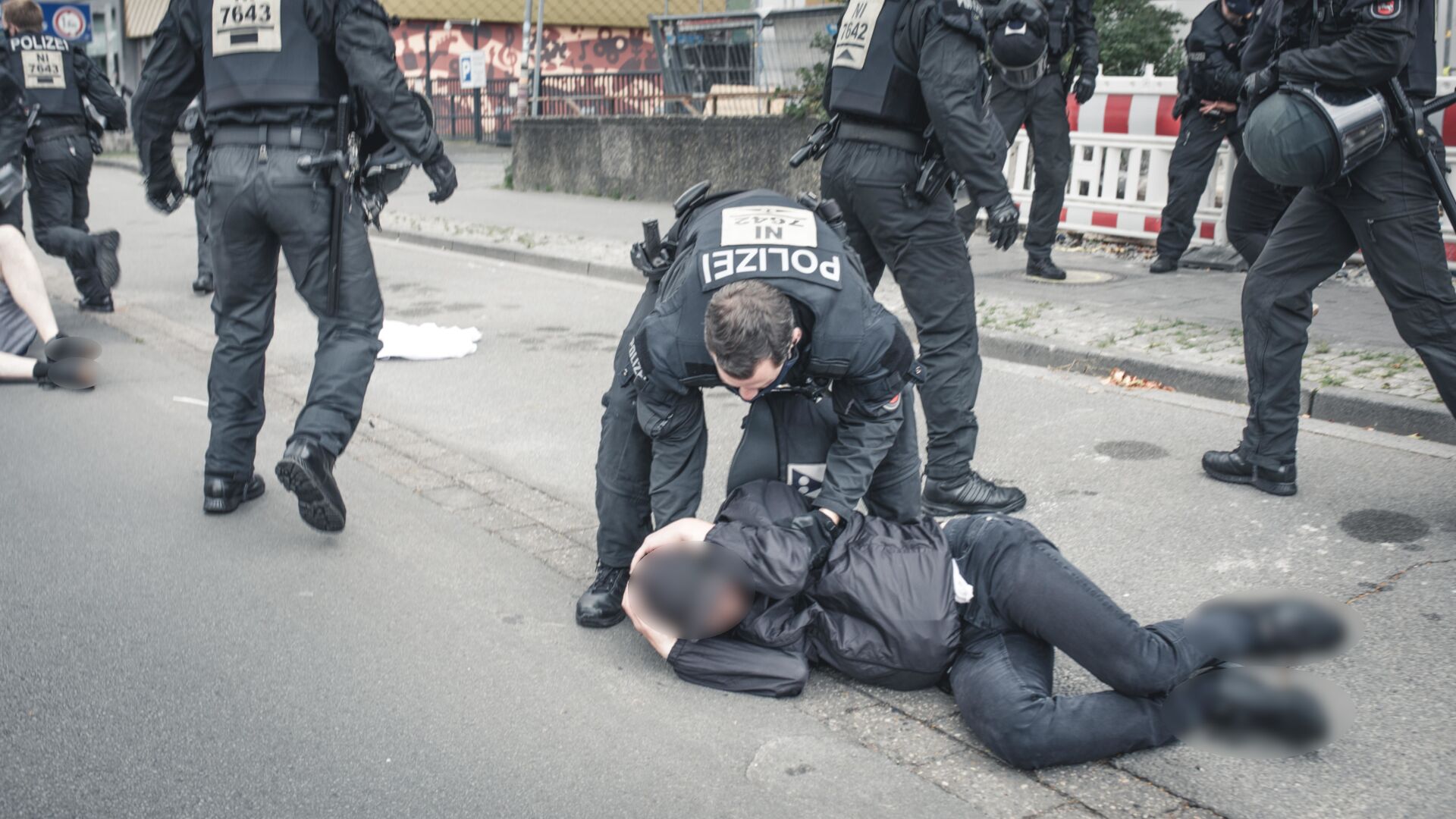 Ohne vorherige Durchsagen oder tatsächlich stattfindende Blockaden, wurden etwa 20 Genoss*innen von dutzenden BFE-Einheiten überrannt und teilweise durch Faustschläge auf Kopf und Gesicht, Zerren, Schubsen und Tritte verletzt. Mehrere Antifaschist*innen die versuchten, vor den gewalttäigen Polizist*innen wegzurennen, wurden in vollem Lauf durch gezielte Schläge und Tritte zu Boden gebracht.