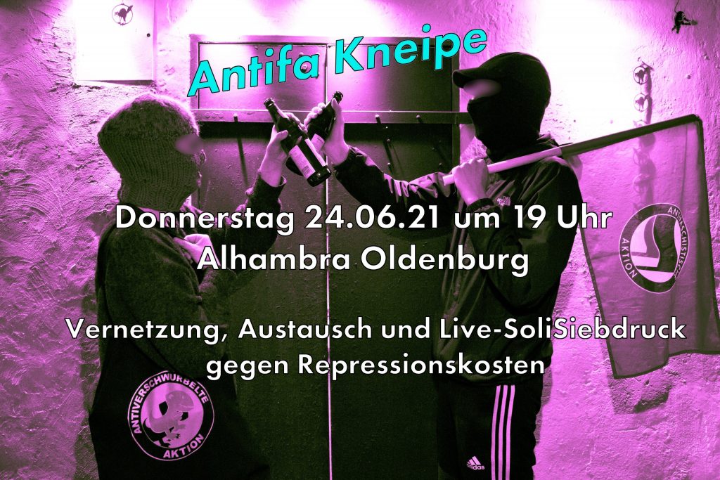 Diesen Donnerstag, den 24.06.21 könnt ihr ab 19:00 Uhr ins Alhambra zur Kneipe kommen, euch vernetzten, coole Siebdruckmotive gegen Repressionskosten abstauben und euch mit Genoss*innen austauschen. Testet euch gerne vorher.